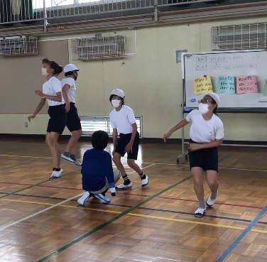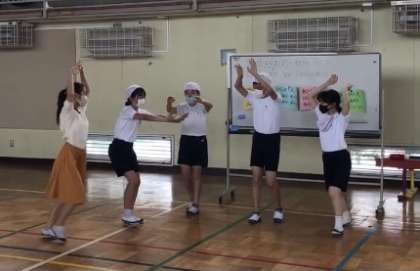 四つの工夫(動き、空間、かかわり、リズム)を取り入れて、「はじめ-なか-おわり」という一連の流れのある動きを考えて表しました。