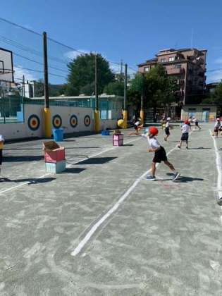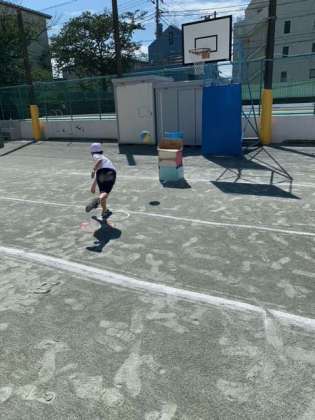足を踏み出し、腕を振って投げることをめあてに、ボール投げを楽しみました。