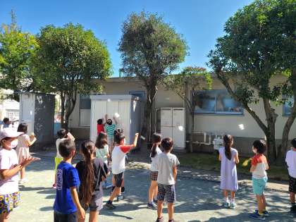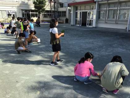 天気のいい日に鏡を使って「光の進み方」の実験をしました。校庭で光がまっすぐ進むことを地面をはわせて確認しました。