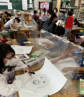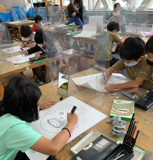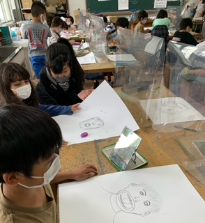 今日は「顔」をかきました。鏡を見ながらじっくりと自分の顔と向き合ってかきました。「なんとなく似てるね!」「目が上手だね!」感想が飛び交いました。