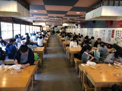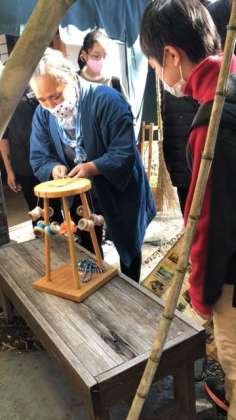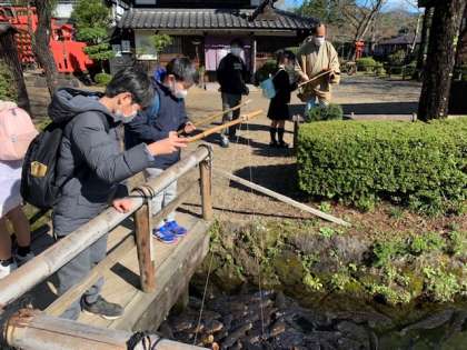 のどかに鯉釣り、組紐体験、奉行所の劇など、グループごとに江戸村を楽しんでいます。