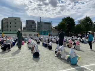 昨年からの感染症対策の為、これまでは教室での訓練でしたが、久しぶりに全校児童で校庭避難を行いました。