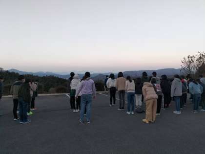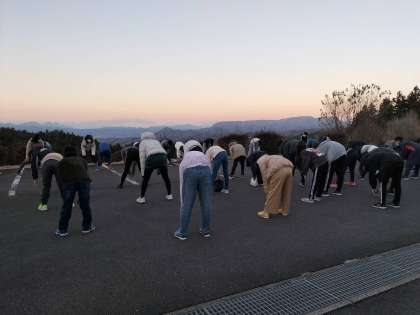 朝会です。まだ太陽は見えません。とても寒いです。ラジオ体操で体と心を起こします。川場移動教室の2日目、始まります。