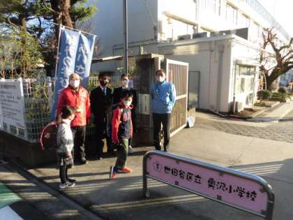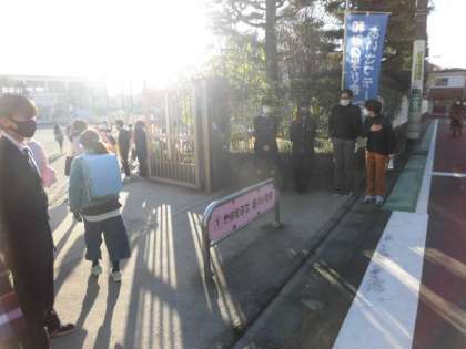 昨日の雨は上がり冷えこんだ朝「学び舎あいさつDAY」でPTAの会長さんを始め奥沢中学校の生徒さんが来校してくれました。
