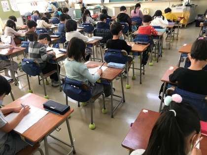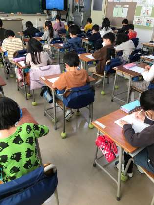 背筋を伸ばして、静かな心で、皆いい字を書くことができました。冬休みにも頑張って練習したのがわかりました。廊下に掲示されると、嬉しそうに眺めていました。