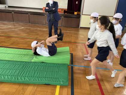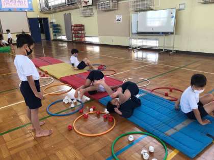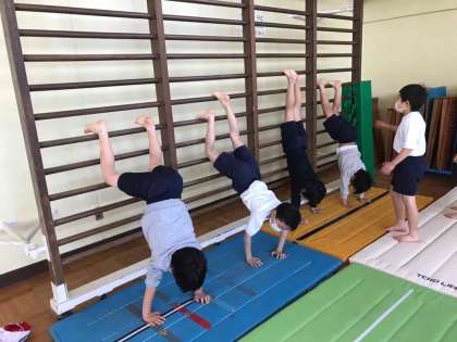 壁登り逆立ち、前転がり、後ろ転がり、友達と動きを合わせての前転がりなど。「先生、〇〇くんが前転がりできるようになったよ。」友達ができるようになったことをグループみんなが喜んで報告してくれます。