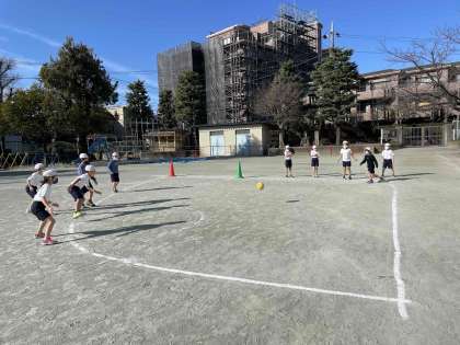 体育のボールけり遊びで、キックベースボール型ゲームをしています。