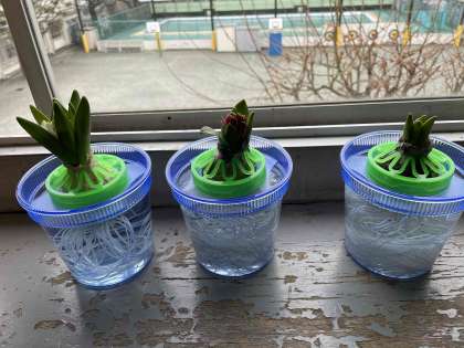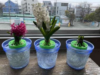 教室では、12月からヒヤシンスを水栽培で育てています。2月に入って蕾がほころび、花が咲き始めました。
