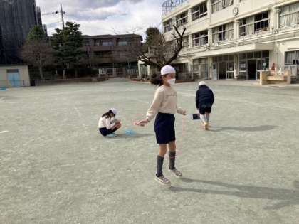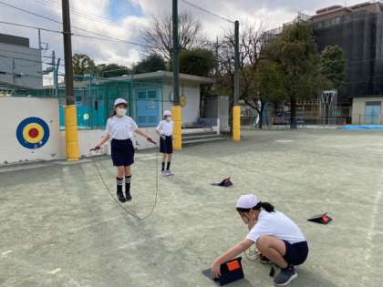 たくさんの回数を跳ぶのではなく、リズムに合わせて技を組み合わせながら跳ぶ練習です。タブレットを使って自分の演技を撮り、検定を受けて合格を目指します。