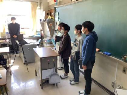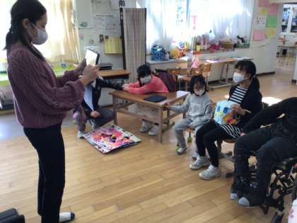 写真は、作品紹介動画を撮影しに、つくし学級と五年生にお邪魔しているところです。
