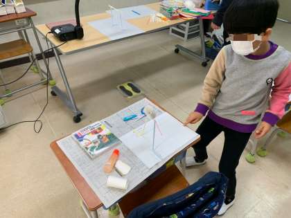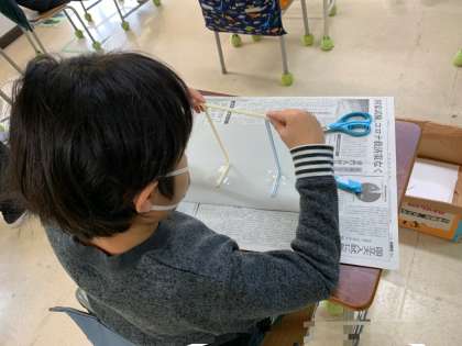 図工科で工作をしました。ストローで高跳びのバーを作り、トイレットペーパーで作った自分の好きな虫を指で押して跳ばし、スポーツ大会を行いました。