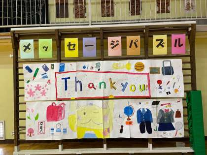 5年生の提案パート2です。各学年の出し物の後に、パズルが完成していきました。もうすぐ最高学年になる5年生が、下級生に呼びかけてプレゼントした、ありがとうのメッセージです。