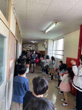 会が終わって教室へ帰る6年生を、下級生が拍手で迎えます。廊下が、笑顔と拍手であたたかな雰囲気に包まれました。