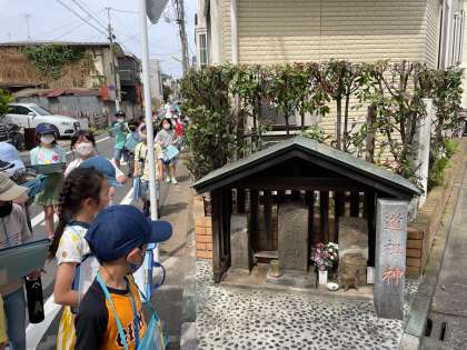 この日は学校の北側の探検です。2年生の町探検と違うのは、土地の使われ方や交通の様子、昔から残るものや目印となる施設等に目をつけ、奥沢の町全体を広い目で見てくることです。