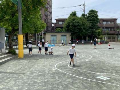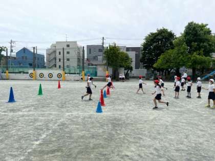 2年生は校庭体育で、いろいろな跳躍をする運動の学習に入りました。