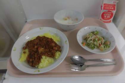 本日は色鮮やかなターメリックライスに、豆入りキーマカレーでした。