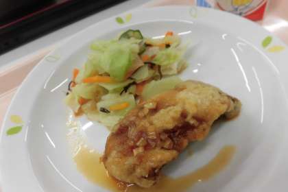 大きな肉厚のあじの切身に少しピリ辛のタレをかけました。
