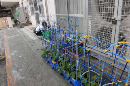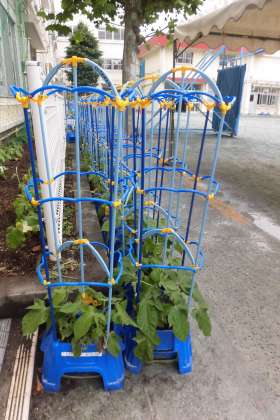 各クラスで、それぞれの植木鉢に支えをたてお水をあげ、本葉がすくすくと伸びてきました。夏に花を咲かせるのが楽しみですね。