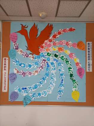 奥沢発表会の成功に向けて、一人一人の手形と目標を書いた尾をはりつけ、『つくしフェニックス』を作りました。