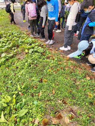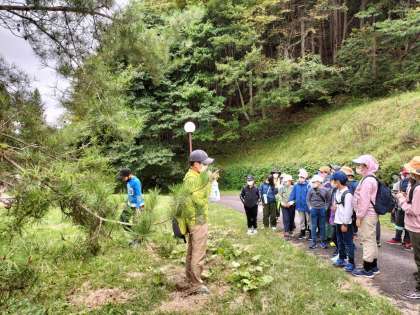 里山入門…へびの住処をみたり、松ぼっくりをどんな風に動物が食べるのかみせてもらったり。栗のイガに5年生は夢中でした。