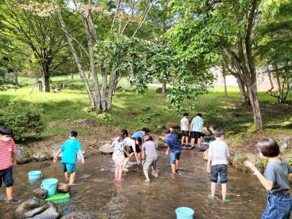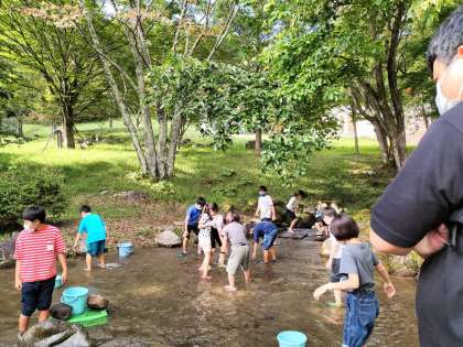 お水が綺麗!冷たいけど楽しい!こっちいるよ!がんばれーここここ!互いに応援しています。コツを伝授し合う様子もありました。笑顔あふれる時間でした。