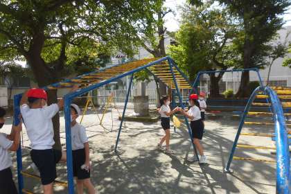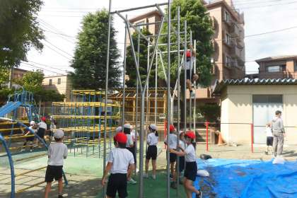 校庭の遊具で3年生が理科の実験「音の伝わり方」を調べていました。