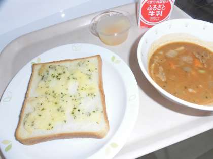 ピザソースはありませんが、トマト風味のビーンズシチューでとてもバランスよく食べられたのではないでしょうか。