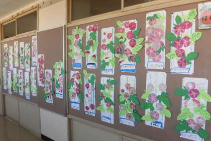 1年生の廊下にはその朝顔で作ったきれいなたたき染めと押し花が飾られています。