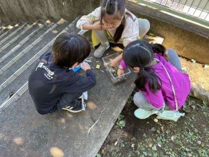 生活科の学習で、生き物を観察したり、飼育したりする学習を行っています。小さな生き物たちがどんな場所に住んでいてどんな物を食べて生活しているかを調べ、その環境を作って飼育します。身近な生き物に親しみ、命を大切にすることを学びます。