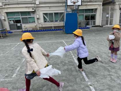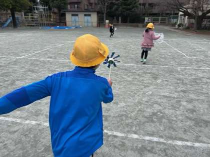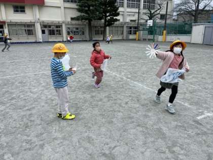 「ふゆとともだち」の学習で、紙コップで作った風車やビニール袋を使って、風遊びをしました。