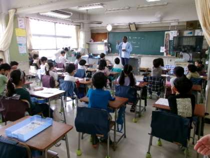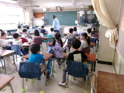 今日は、2年生がALTと一緒に外国語活動の学習をしました。自己紹介の言い方に慣れ親しみ、隣の席の友達と名前や生まれた場所を伝え合いました。楽しく参加できました。