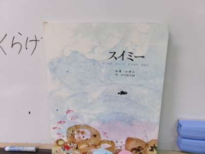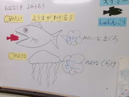 わかば学級では、国語で「スイミー」を学習しました。担任がビッグブックを使って読み聞かせをし、今日は特に「○○のような」や「●●みたいな」に注目しました。子どもたちは、担任と一緒に「●●みたいな」と言ってみたり、何に例えられるかを一緒に考えたりしました。このフレーズが使えるようになると表現力がぐんと伸びますね。