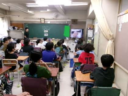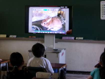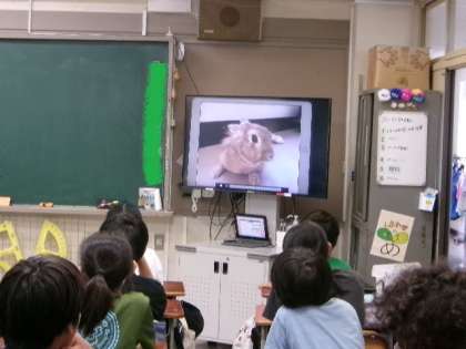 今日は、朝の時間に飼育委員の児童が放送による集会を開きました。内容は、奥沢小学校で飼っているうさぎの「コムギ」についてのお知らせでした。「コムギ」のことを知ってもらおうと、名前の由来や1日の「コムギ」の生活などについて、クイズを出したり、動画を見せたりして紹介し、全校児童を楽しませました。