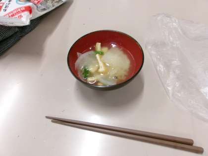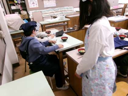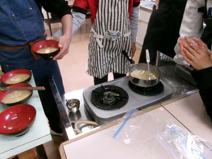 5年生は家庭科で、調理の学習をしています。今日は、材料を切ったり、鍋を火にかけ出汁をとったりして、味噌汁を実際に作りました。出汁は煮干しでとりました。児童がそれぞれに準備した具を入れて、味噌をとき、味噌汁の出来上がりです。盛り付けもうまくできました。自分たちでつくった味噌汁の味はとてもおいしく、笑顔がこぼれた表情からは、出来栄えに満足しているようでした。