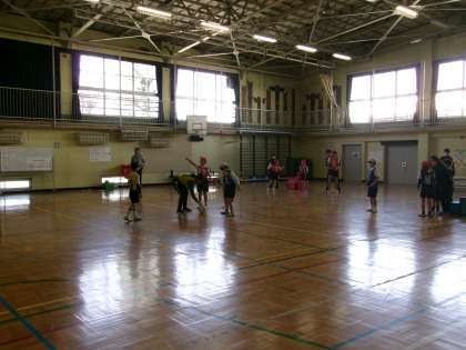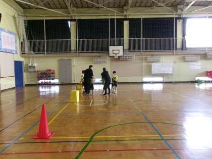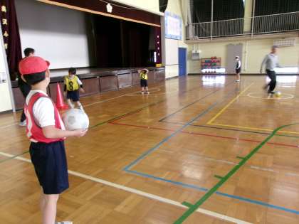 わかば学級では、体育でゴール型ゲームに取り組みました。これまで、パスやドリブルの練習をしており、今日はこの単元最後の授業です。各チームしっかりと作戦を立て、試合の臨みました。上手にゴールを決めることができた児童からは、「ボールをしっかり追いかけるとよい」というアドバイスをみんなに伝えていました。
