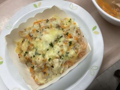 トマトジュースで炊いたご飯にホワイトソースをかけた