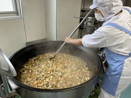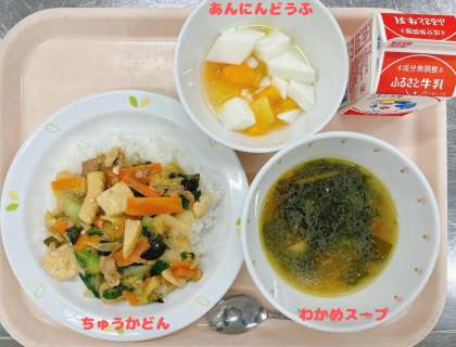 中華丼の具には、沢山の野菜だけでなく、きくらげや筍、イカやエビも使用しているため、とても食べ応えのある献立となりました。各クラスのご飯の減りがとても早いように感じました。