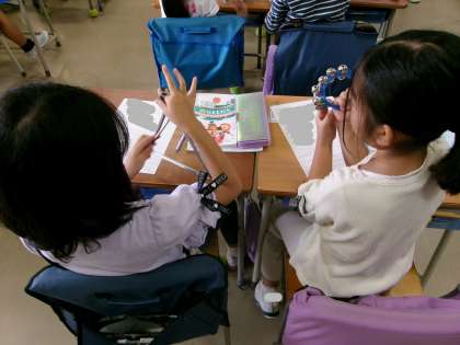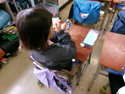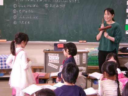 1年生は音楽で、リズム楽器の学習をしています。すずやトライアングルを使って好きな音色の鳴らし方を学びました。友達とリズム遊びをしたり、工夫した音色を聞き合ったりして、音楽を楽しみました。