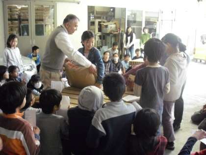 子どもたちは30キロの米袋を持ち上げて数メートル運んだり、一等米二等米について話を聞いたりしました。