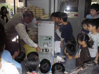 精米についての説明を聞き、実際に精米してでた糠やおにぎりを食べさせていただきました。