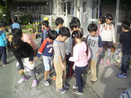 昇降口で、アルミ缶を持ってくる子を待ち構えて、たくさん集めようと一生懸命です。