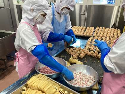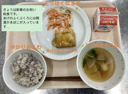 今日は新春献立です。あげの福袋の中には梅か雪だるまのかまぼこが2枚入っています。