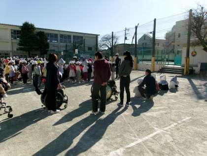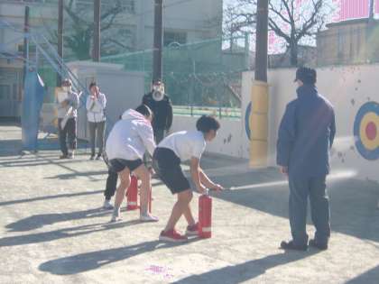 今日の避難訓練は火事の想定で行いました。校庭での講話では、放送をしっかり聞いて情報を得ること、火元からできるだけ離れたところを通って避難すること、姿勢を低く口と鼻を覆って避難することなどを話しました。何よりも火は便利でもありますが、とても怖いもので子どもたちの力では収めることが難しいことから、子どもたちだけで火を扱ってはいけないことを心に留めてほしいと思います。その後、消防署から消防隊員の方が来てくださり、消火器の使い方を教えてくださいました。代表児童と代表教員が、実際に消火器の使い方を実践しました。子どもたちは自分たちで消火しようとしなくてよいとのご指導もいただきました。
