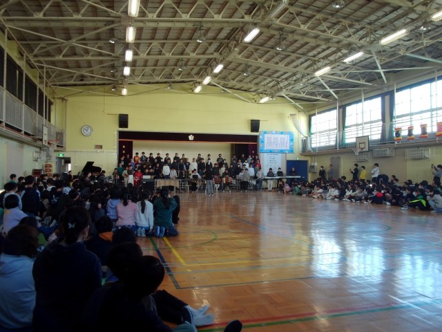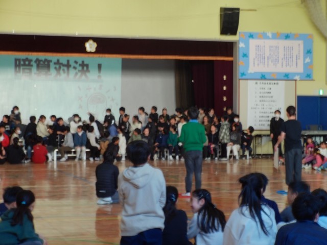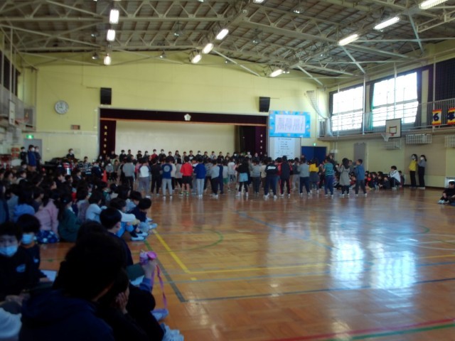 今日は、朝の時間から1時間目までを使って、「6年生を送る会」を行いました。どの学年・学級の児童も、この日のために6年生への感謝の気持ちを込めて、出し物の練習をしてきました。歌、ダンス、6年生にちなんだクイズ、群読、合奏、芝居等、様々な出し物で6年生を楽しませました。6年生が卒業した後のバトンを受け継ぐ5年生は、「6年生と直接対決」をしました。それぞれの学年の代表児童が早口言葉や暗算等で対決し、会場を盛り上げました。6年生からのお礼の出し物は、体育の発表と音楽の合奏です。そのすばらしさに「さすが6年生!」という雰囲気に包まれ、会が終了しました。下級生からの思いを受け取った6年生。残り少ない小学校での日々を大切に過ごしたい思いが強くなったようです。