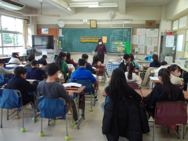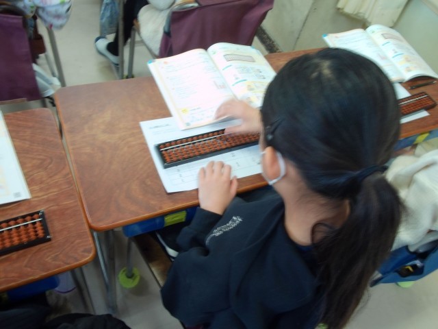 3年生が算数の学習でそろばんの使い方を学んでいます。地域の方をゲストティーチャーとしてお迎えし、指使いや計算の仕方などを教わりました。1桁のたし算・引き算から、2桁、3桁とだんだん数が増えていきましたが、みんな一生懸命にそろばんを使って計算し、正確に答えを導き出すことができていました。