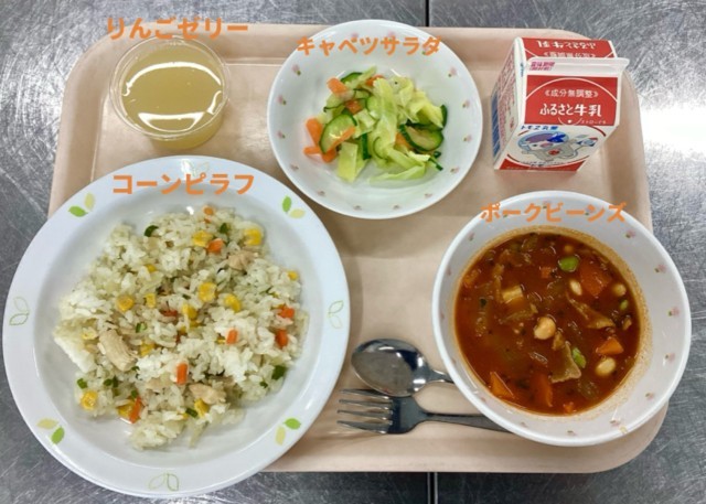 今日はポークビーンズでした。豚肉と大豆、枝豆などをケチャップやトマトピューレで
