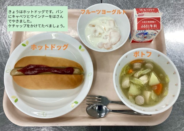 今日はホットドッグです。コッペパンにキャベツとウインナーをはさんで焼きました。