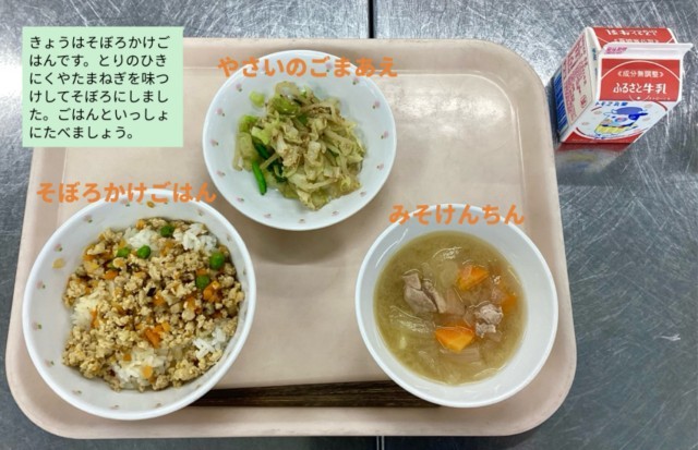 今日はそぼろかけごはんです。鶏ひき肉や玉ねぎ、にんじんをしょうゆやしょうがで