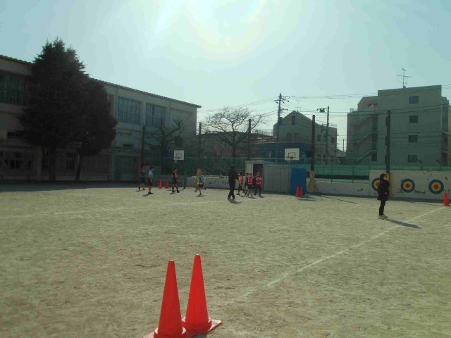 6年生は体育で、タグラグビーの学習をしています。ラグラグビーはボールの代わりに腰に付けたタグを奪うゲームです。タグを奪うことでけがの危険を防ぐことができ、自分たちでよりよいルールに改善しながら取り組めるので、体育の学習に適しています。晴天が続いているので、校庭で元気に体を動かすことができています。