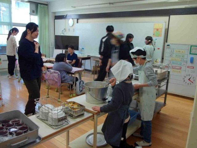 今日から、2~6年生とわかば学級・つくし学級では、給食が始まりました。さっそく今日から給食当番の子たちが仕事を引き受け、大活躍でした。今年度初めての給食の感想を聞くと、どの学級でも「おいしい!」という声が元気に返ってきました。今年度も、命や食に関わる全ての方に感謝しながら給食をいただきたいものです。